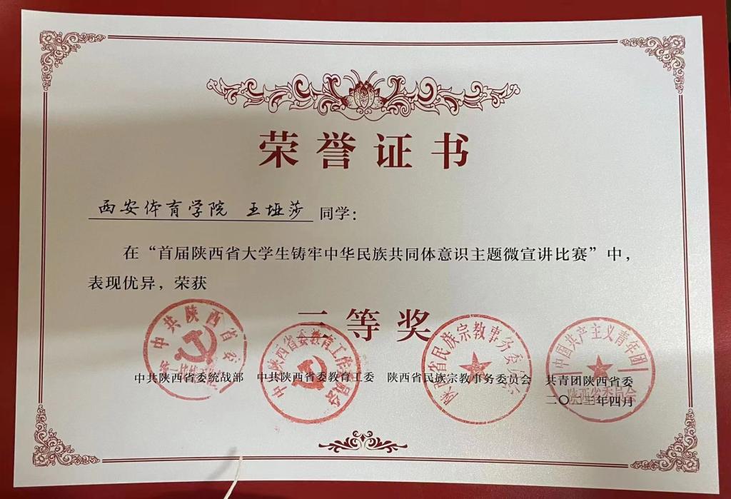 另悉,在刚刚结束的全省大学生铸牢中华民族共同体意识主题微宣讲比赛中,我校体育新闻与传媒学院学生王垭莎荣获大赛三等奖。