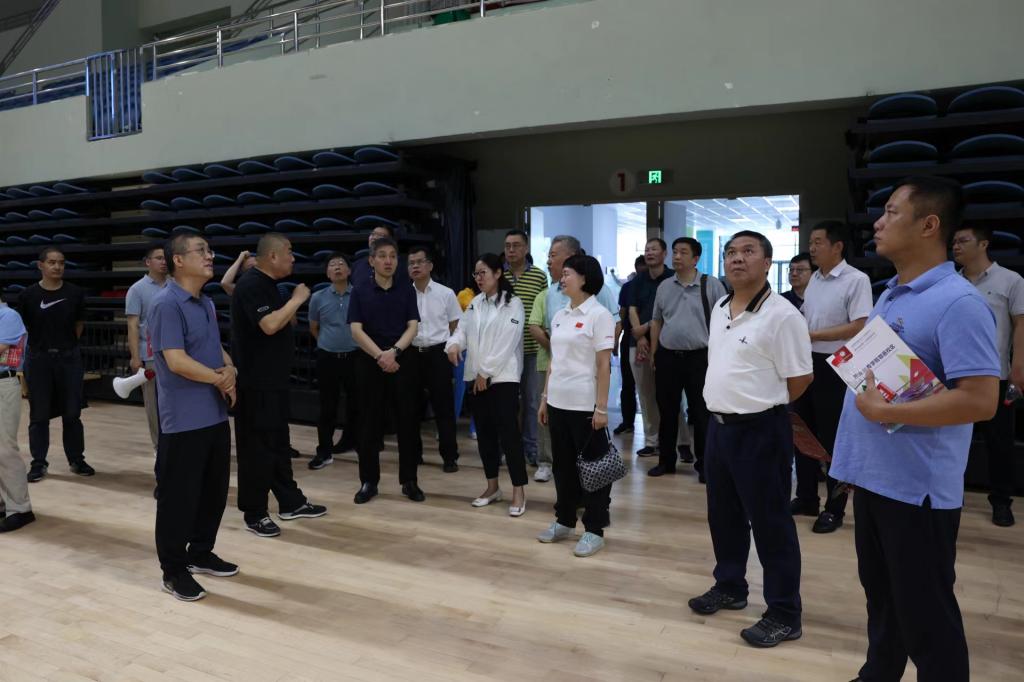 本网讯 8月3日上午,第十五届全运会广东赛区执委会副主席、广东省体育局局长崔剑带队,执委会一行三十二人来我校鄠邑校区参观调研。陕西省体育局副局长张王平、陕西省体育局二级巡视员郭文陪同参观,我校党委副书记高玉峰及相关部门负责人热情接待。