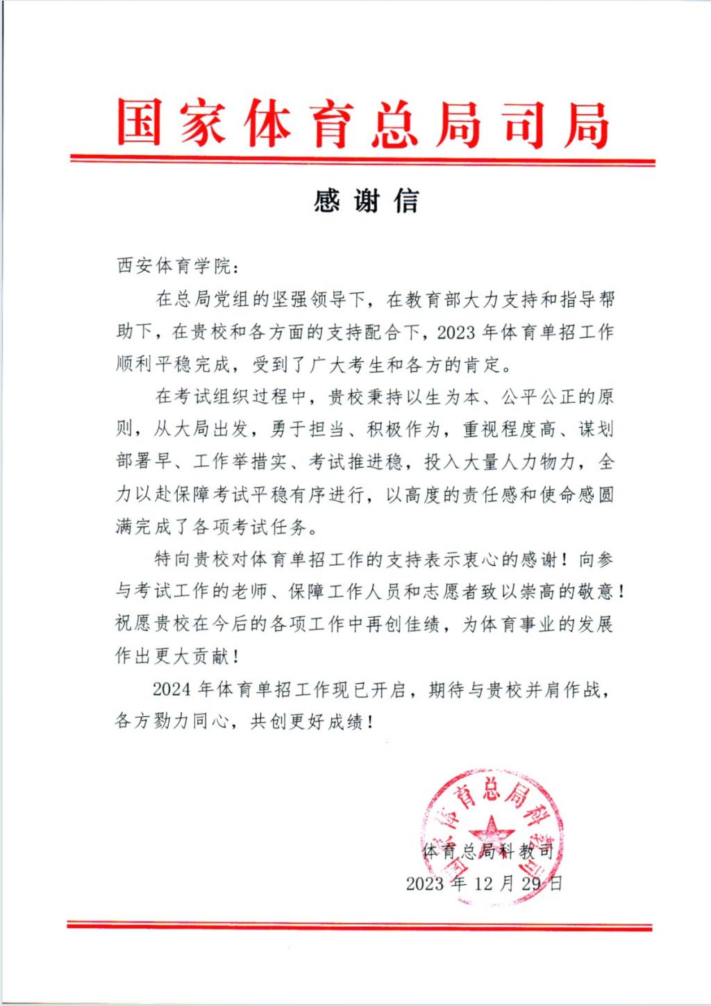 本网讯     近日,国家体育总局科教司致以一封感谢信,对我校在2023年度全国运动训练、武术及民族传统体育专业招生考试中出色完成的部分项目专项考试任务表示了诚挚的谢意和高度认可。