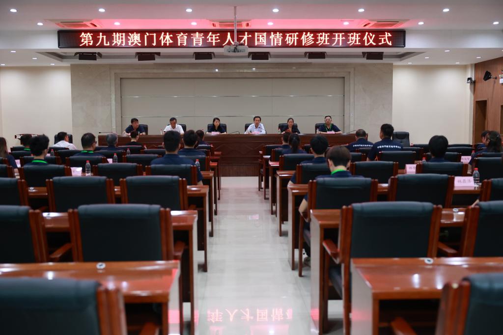 本网讯 7月19日,第九期澳门体育青年人才国情研修班开班仪式在我校举行。省委港澳办二级巡视员姬文魁,省体育局二级巡视员苏晓刚,研修班顾问、澳门中联办宣文部副部长白冰,研修班班长老杰龙及澳门中联办、澳门体育总会联合会相关人员、研修班全体学员参加开班仪式。我校副校长谢英出席并主持仪式。
