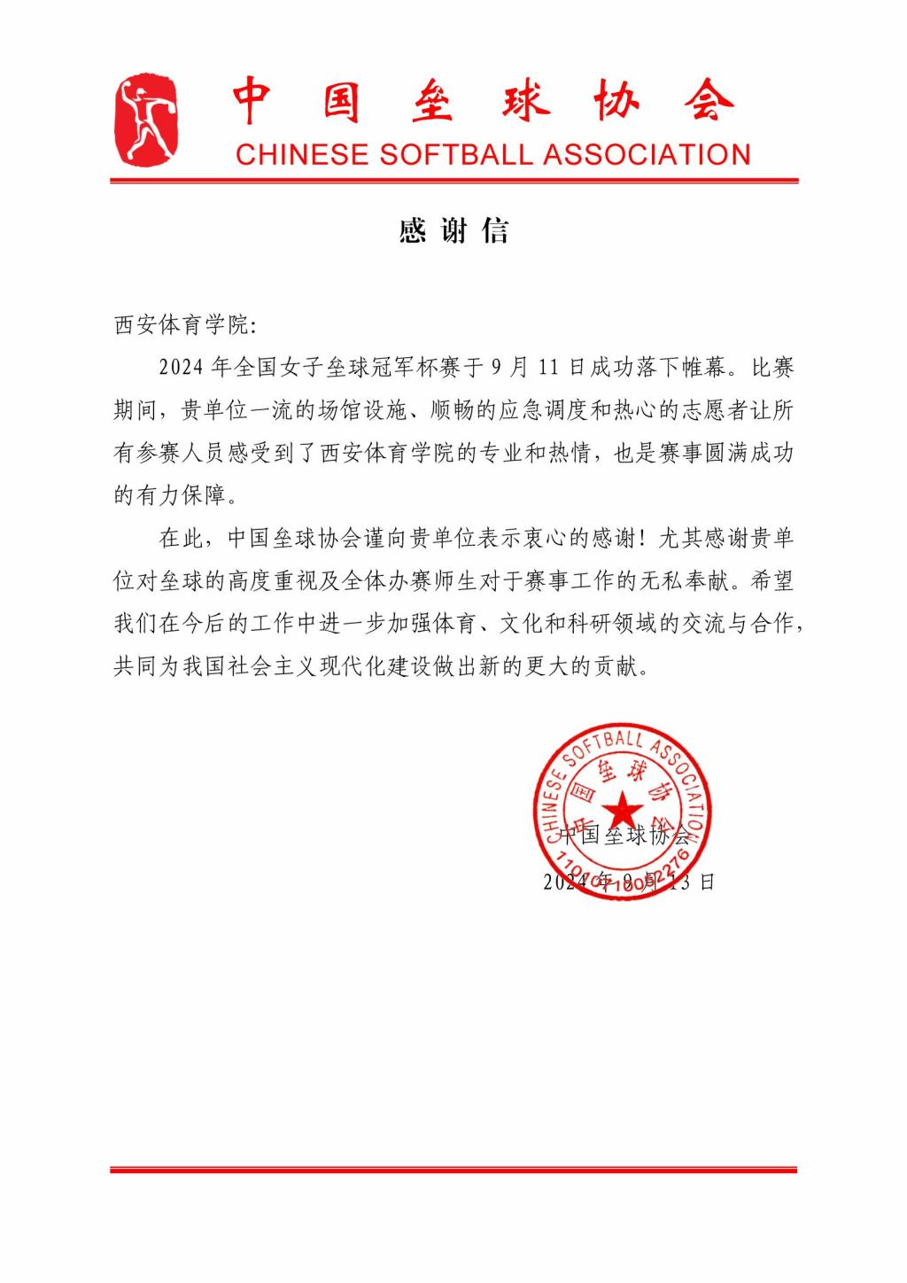 本网讯 由我校承办的2024年全国女子垒球冠军杯赛于9月11日圆满落幕。 近日,中国垒球协会向我校致信,感谢我校在垒球推广和发展中的重要作用及全体办赛师生的无私奉献精神。
