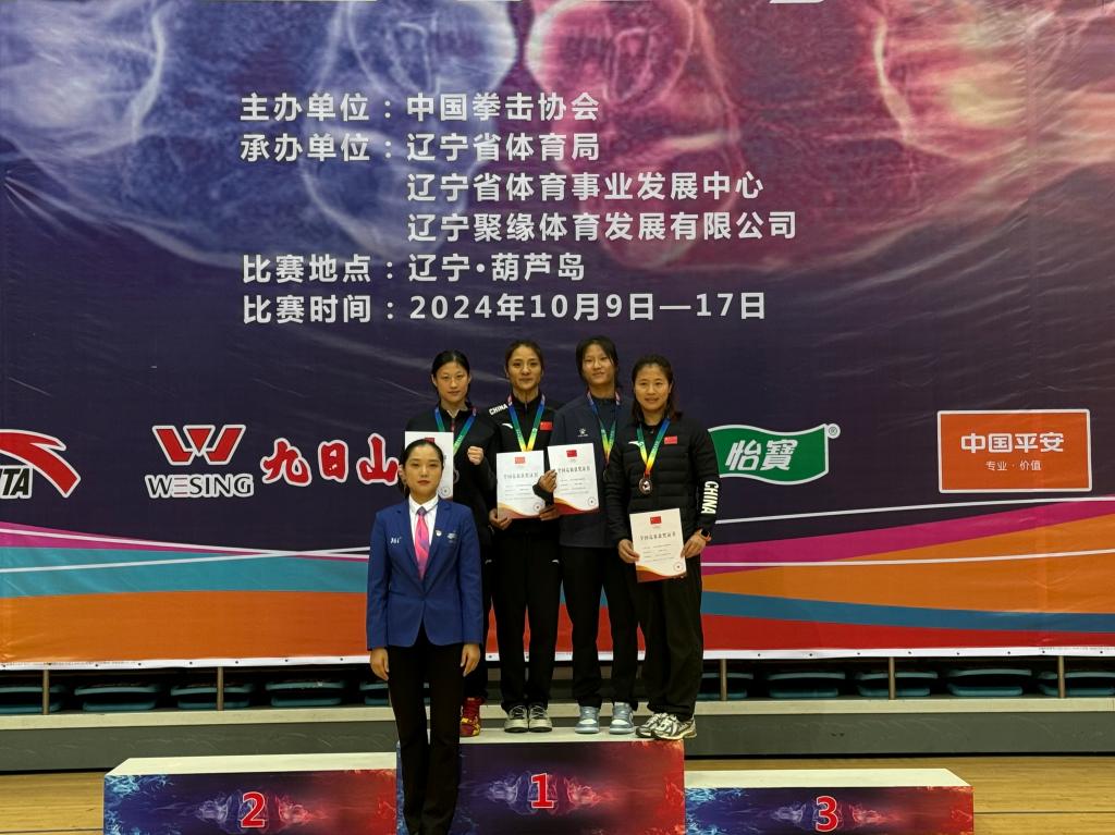 本网讯 日前,2024年全国女子拳击冠军赛在辽宁葫芦岛举行。我校教师刘飘飘以5:0的绝对优势,取得52-54公斤级冠军,我校学生田淑文获得66-70公斤级亚军,朱亚姝、齐昕宇分别取得第五名。