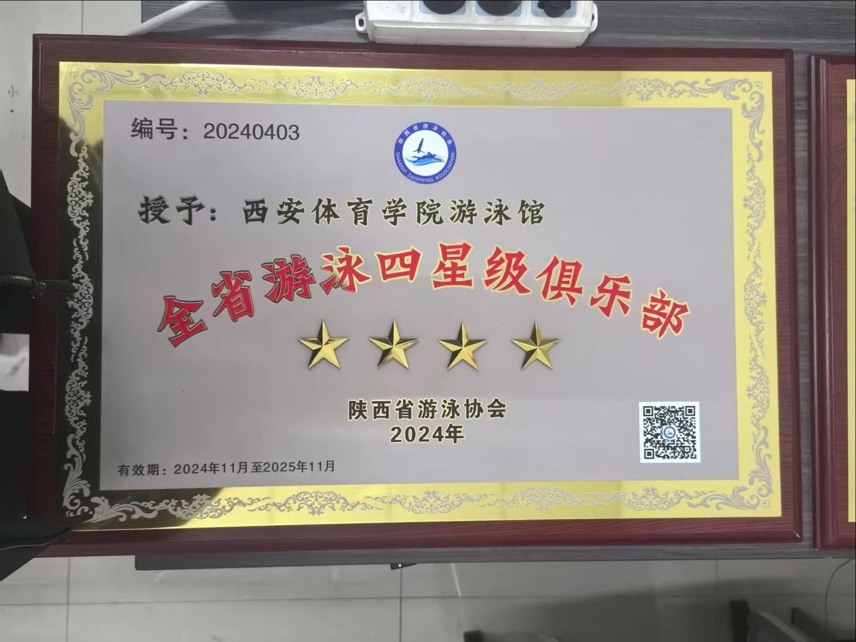 本网讯    近日,经过体育俱乐部自查申报、协会初筛、实地评审等环节,报省体育总会复核,省游泳协会对2024年度陕西省社会体育俱乐部(游泳)星级评定结果进行公示,共评定四星级5家、三星级6家、二星级3家,我校游泳馆被评定为四星级。另外,游泳馆还获得了碑林区文化旅游体育行业系统优秀单位称号,负责人宋维斌同志也被评委碑林区年度先进个人。